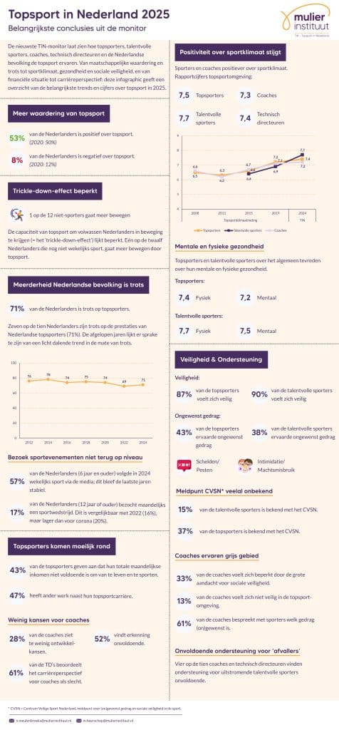 Het Mulier Instituut heeft, in samenwerking met het ministerie van VWS, NOC*NSF en Vereniging Sport en Gemeenten (VSG), de monitor ‘Topsport in Nederland’ (TiN) ontwikkeld. In de monitor volgen de onderzoekers verschillende ontwikkelingen in de Nederlandse topsport. In het najaar van 2024 verscheen de eerste rapportage. Voor deze tweede publicatie hebben de onderzoekers ook grootschalig data opgehaald onder topsporters, talentvolle sporters, coaches en technisch directeuren van bonden. De belangrijkste bevindingen zijn weergegeven in onderstaande graphic.