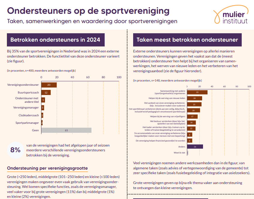 Bij 35 procent van de sportverenigingen in Nederland was in 2024 een externe ondersteuner betrokken. Bij 8 procent van deze verenigingen waren zelfs meerdere verschillende ondersteuners. De functietitel van deze ondersteuner varieert. Het vaakst noemen verenigingen ‘verenigingsondersteuner’ en ‘buurtsportcoach’. Dat blijkt uit een peiling bij het verenigingspanel van het Mulier Instituut.