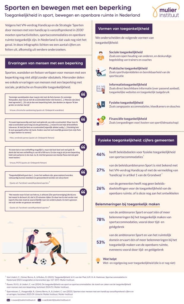 Toegankelijkheid is veel meer dan alleen fysiek ergens kunnen komen en meedoen. Het gaat bijvoorbeeld ook over informatietoegankelijkheid en sociale toegankelijkheid. Het Mulier Instituut volgt tot en met 2030 ontwikkelingen in het kader van de Missie Sporten voor mensen met een handicap vanzelfsprekend in 2030. Lees er hier meer over.