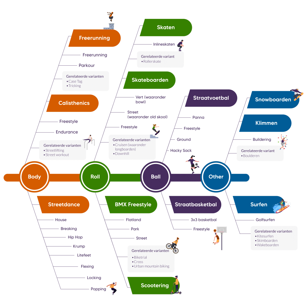 We hebben urban sports ingedeeld in vier hoofdcategorieën: ball, body, roll en other. Binnen deze categorieën maken we onderscheid tussen kernvormen, varianten daarvan en gerelateerde varianten. De indeling is te zien in de figuur.