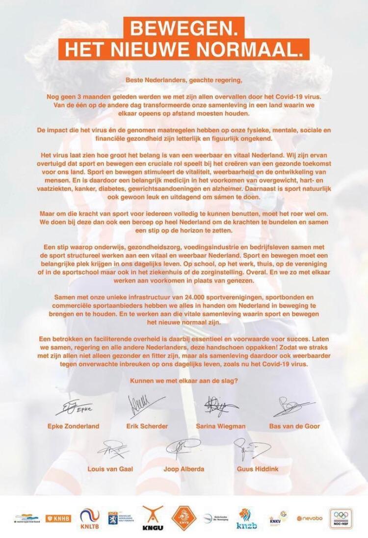 Zeven sporticonen roepen in dit manifest (dat verschenen is als een landelijke advertentie) de regering en ‘de Nederlander’ op werk te maken van een vitale samenleving, met daarin een cruciale rol voor sport en bewegen.